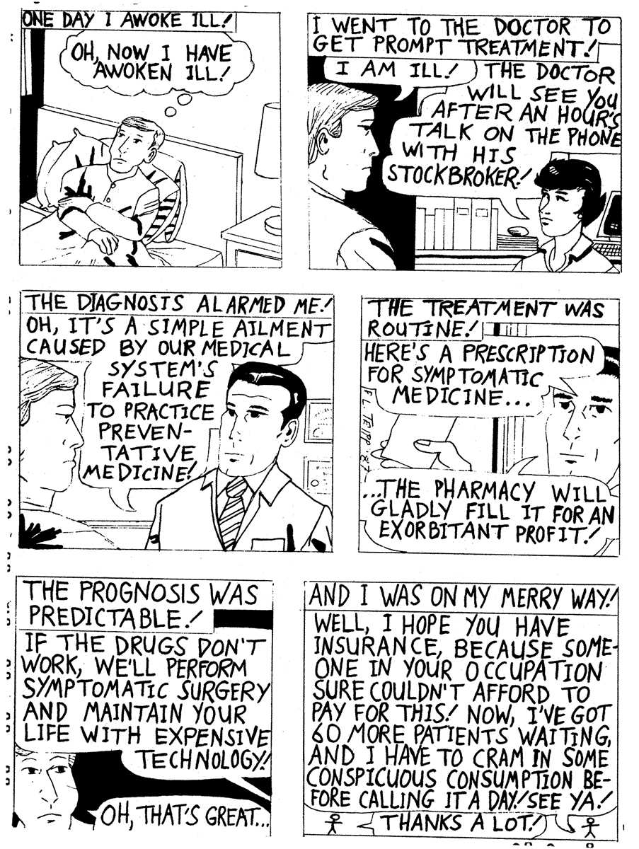 After 1945, as antibiotics, new surgical techniques, and other innovations revolutionized western medicine, hospitals belatedly began to undergo the same process that had overtaken so many other industries--mechanization. Only fifty years ago hospitals were health care "workshops," where acutely ill or severely injured patients were brought to receive last-resort care--usually surgery, or else merely asepsis, anesthesia, food, and rest. The most expensive technology was probably the hand-cranked operating table or the autoclave that sterilized the instruments. Today, hospitals are highly diversified factories for testing, drugging, and operating on patients with a vast range of complaints, many of which were either untreatable or unheard-of a generation ago. The typical hospital continually sprouts new specialized wings, "centers," and clinics, and invests in hundreds of thousands of dollars worth of new diagnostic and surgical equipment every year. Moreover, the care in many hospitals, especially giant chains like Kaiser, has a notoriously assembly-line quality; patients are shuffled from one overworked, harrassed technician, nurse, or intern to the next, like sides of beef in an automated slaughterhouse. So how did this expansion happen? Or, as a Bank of America billboard once asked: