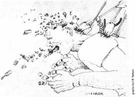 I must confess the first several visits I found the sight of multiple recliningbodies hooked up to machines somewhat comical, reminding me of the movieA Boy and His Dog ("What God has joined let no man put asunder").But just like the acrid stench from the local paper factory, I've becomeaccustomed to the sight and now I don't find anything particularly odd,ironical, or otherwise notable about it, though I keep looking for the hiddenmeaning, as if it has only temporarily gone undercover and will re-emergeif I just stare long enough without blinking.